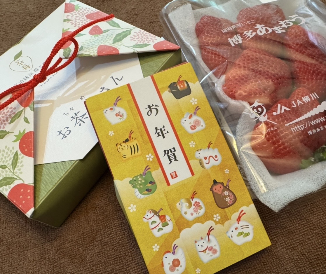いちごあまおうは、とても大粒で甘さ格別!お年賀の中には馬の飴ちゃんが入っていました。